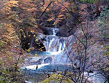 目当ての「七ツ釜五段の滝」までもう少しというところで、大渋滞。一人がやっと通れる細い道なので、急ぐわけでもなしとのんびりと待ち、お目当ての滝へ。